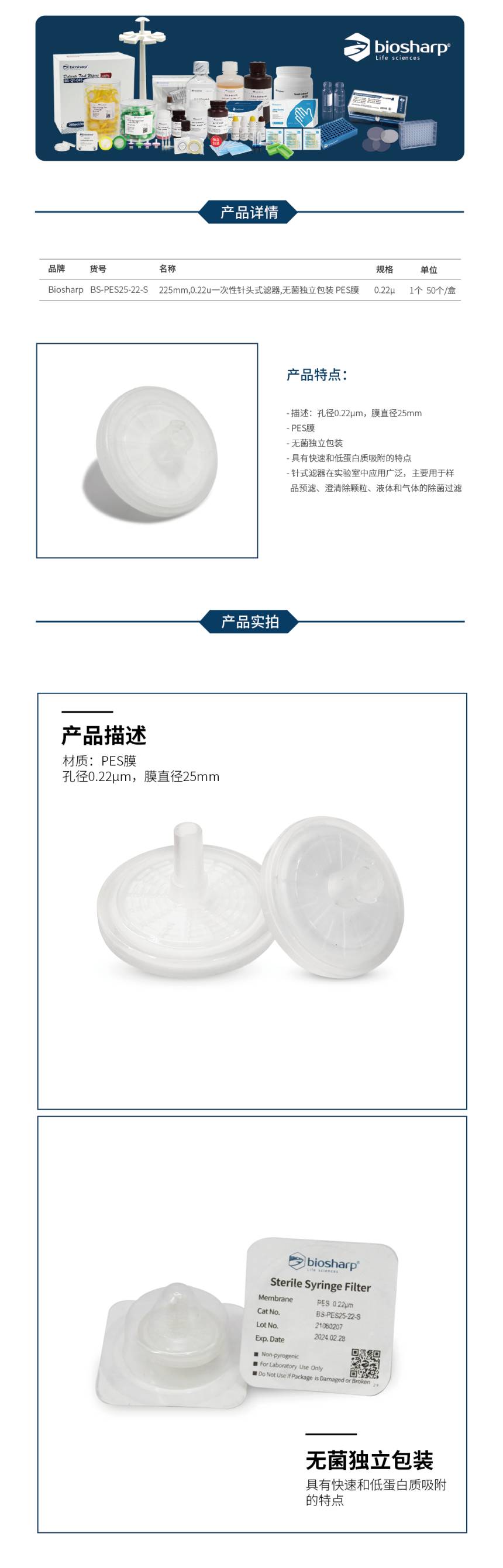 | BS-PES25-22-S | Biosharp | 无 | 1个,50个/盒 | 230 | 169 | 无 |